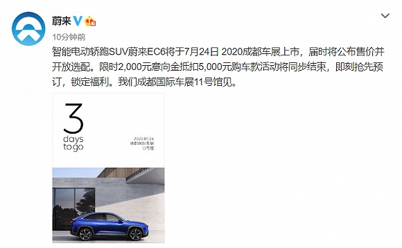 智通财经APP获悉,7月21日,蔚来汽车(NIO.US)官方微博宣布,智能电动轿跑SUV蔚来EC6将于7月24日2020成都车展上市,届时将公布售价并开放选配。