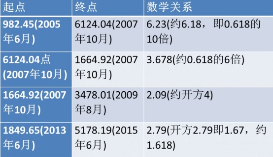 那上证指数呢?如果有留意笔者著作,上证指数的密码则是0.618的倍数及开方根。我们利用上证指数不同的高低点作起点,如下图所列发现各高低点都存在不同的比率关系。 例如982(2005年6月低点)跟6125(2007年10月的高点)形成了6.23(即0.618的10倍)关系,而6124点跟1664点(2008年10月)形成了3.678(0.618的6倍)关系。