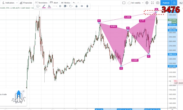 我们再论上证50的走势,下图为周线图,读者可见目前高位在3476点。那3476点的走势我们在比率中形成了1.236的黄金比率关系。所以我们认为读者可以在3476点调整持仓,在突破之前可能会版块轮动。即是资金可能会炒作落后的版块。