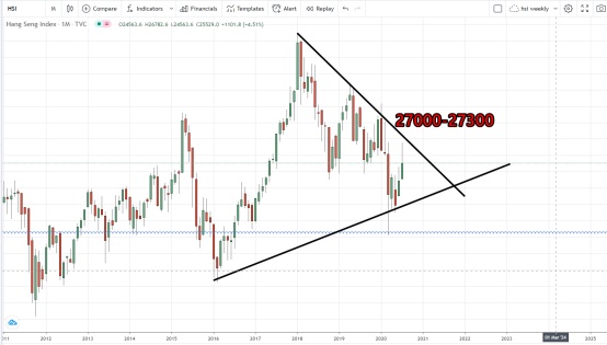那恒生指数目前走势受制在月线图,我们可见受制于27000-27300点。如果能突破可见30000点。