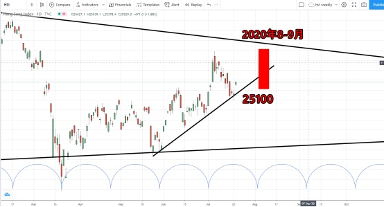 但是在短线,必须不能再一次跌穿25100点,及尽快升穿26100点。否则以大成交见顶论。同样地短线留意7月22日,及中线2020年8月/9月潜在高位的周期。