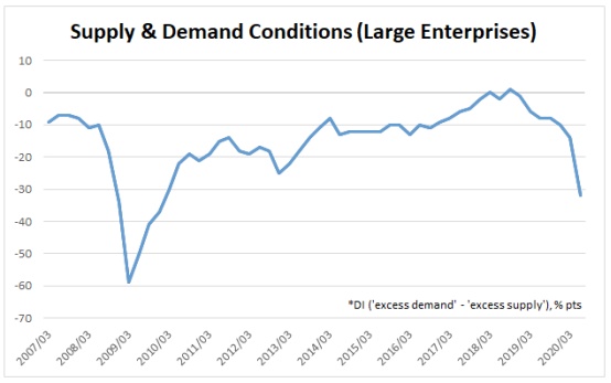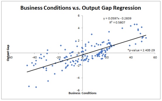 根据商业状况与日本央行研究和统计部门估计的产出缺口之间存在的线性关系来看,随着商业条件的恶化,产出缺口会变得更负(潜在GDP>实际GDP),反之亦然。