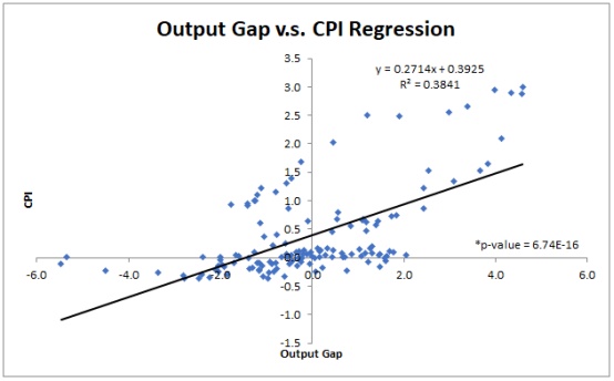 作为通货膨胀的主要决定因素之一,产出缺口的存在意味着通货膨胀的变化。由于很难准确估计产出缺口,以及异常值的数量可观的原因,下图这组变量关系显得不太可靠,但是仍能看出正相关性。
