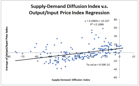 从生产商方面来看,我们还可以观察到短观调查中供求扩散指数和价格指数之间的关系,暗示未来会进一步通货紧缩。随着更多企业宣布供应过剩,更多的公司倾向于宣布价格下跌,反之亦然。不过,由于存在显著的异常值,这种关系并不完全牢固,但是正相关性确实存在。
