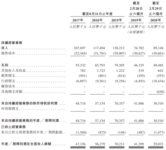 招股书显示,在截至8月31日止的近三个年度(2017-2019财年)来看,在持续经营业务中,公司的收入还是呈现稳健增长,收入由2017财年的1.07亿元(人民币,单位下同)增长至2019财年的1.38亿元。来自持续经营业务的期内利润亦由4871.6万元增长至2019财年的7035.7万元。
