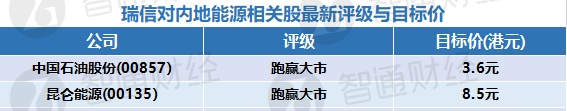 瑞信目前维持中石油及昆仑能源股份“跑赢大市” 评级,目标价分别3.6港元及8.5港元,瑞信指出中石化冠德的分拆表示该公司的业绩有潜在上升空间,同时也将推动公司的估值上涨。