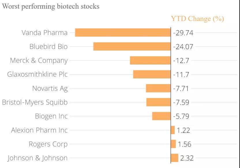 其中,VandaPharmaceuticals下跌最为明显,下跌将近30%;紧接着分别是BluebirdBio、Merck&Company(默克)、Glaxo SmithKlinePlc(葛兰素史克)、NovartisAg(诺华)、Bristol-MyersSquibb(百时美施贵宝)以及BiogenInc(渤健)等等;lexion PharmaInc、Rogers Corp以及Johnson&Johnson(强生)股票上涨速度比较缓慢,但总体表现还算乐观。