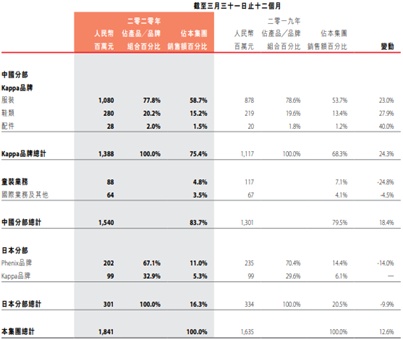 智通财经APP了解到,由于公司此前2019财年更改结算日,因此公布了15个月财务数据,其中不仅中国分部的Kappa品牌销售额同比增长17.1%至15.27亿元人民币(单位下同),是营收增长最大的主力。其它的童装业务,1.51亿元销售额较去年同期小幅增长0.7%,国际及其它业务则是实现143.3%同比大幅增长至7300万元;日本分部的Phenix品牌销售额也有2%同比增长至2.53亿元,Kappa品牌销售额还大幅增长11.1%至1.4亿元,整个日本分部销售额同比增长5.1%。