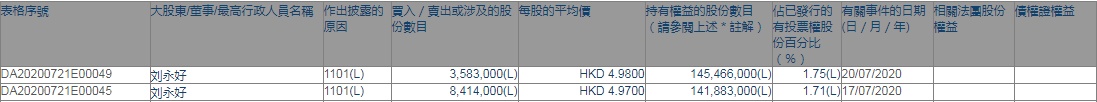 智通财经APP获悉,香港联交所最新资料显示,7月17日和7月20日,非执行董事刘永好两日增持民生银行(01988)1199.7万股,总金额约为5966.09万港元。增持后最新持股数目约为1.45亿股,最新持股比例为1.75%。
