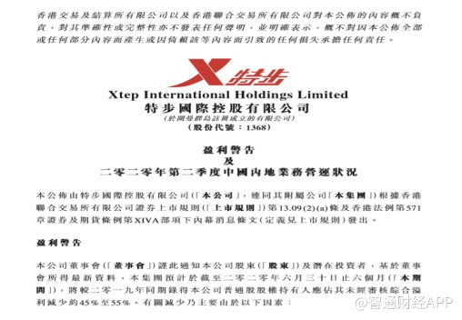 特步公告显示,于2020年上半年,公司普通股股权持有人应占未经审核综合溢利将同比减少约45%至55%,特步主品牌的收入及分部溢利分别实现中单位数及约25%至30%跌幅。