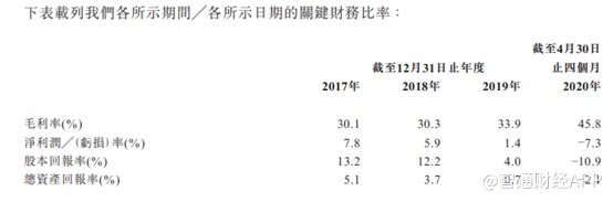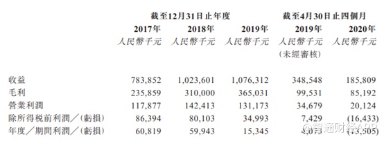 总收入方面,2017年至2019年,公司收入分别为7.84亿人民币(单位下同)、10.24亿及10.76亿元,年复合增长率为17.2%;期内利润为6082万、5994万及1535万元。但是2020年前四个月收入为1.86亿,同比下滑46.8%,期内净亏损1351万元。