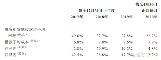 实际上,从2018年开始,喜相逢的收入增速已经出现了下滑,而净利润更是连续大幅下滑。这也说明在车市行情不好时,汽车融资租赁的生意也不好做。在毛利率还算稳定甚至增长的情况下,净利率分别为7.8%、5.9%、1.4%,2020年前四月直接亏损。而这主要是因为期内销售及营销费用率,以及行政费用率不断提升,大幅压缩了利润空间,而这两项费用增加也可以从侧面说明同业竞争的激烈程度正在加剧。2020年因为受到公共卫生事件影响,在业务受到影响的情况下,因为费用支出的增加,导致出现亏损。