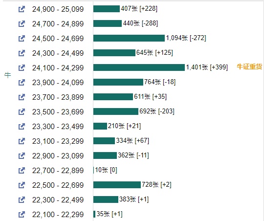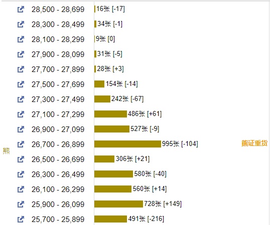 智通财经APP获悉,截至7月22日,恒指最新的牛熊街货比例61:39。摩根恒指牛熊证街货分布图中的数据显示,熊证街货重货区在26700-26899区间,该区间最新熊证数量为995张,较上一交易日减少104张,最多新增25900-26099区间,该区间最新熊证数量为728张,较上一交易日增加149张。牛证街货重货区在24100-24299区间,该区间最新牛证数量为1401张,较上一交易日增加399张,最多新增区间也在该区间。