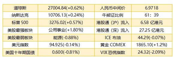 1、隔夜美股市场投资者密切关注国际地缘政治风险、企业财报以及美国国会就新一轮财政刺激政策进行的谈判。美股全线低开,盘中维持窄幅震荡,尾盘大幅拉升。截至收盘,道琼斯指数涨165.44点,涨幅0.62%,报27005.84点;标普500指数涨18.55点,涨幅0.57%,报3275.85点;纳指涨25.76点,涨幅0.24%,报10706.13点。港股ADR指数全日走稳,按比例计算,收报25088点,升31.05点。昨日尾盘被消息错杀的恒生指数,今日应反弹。