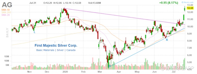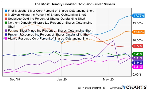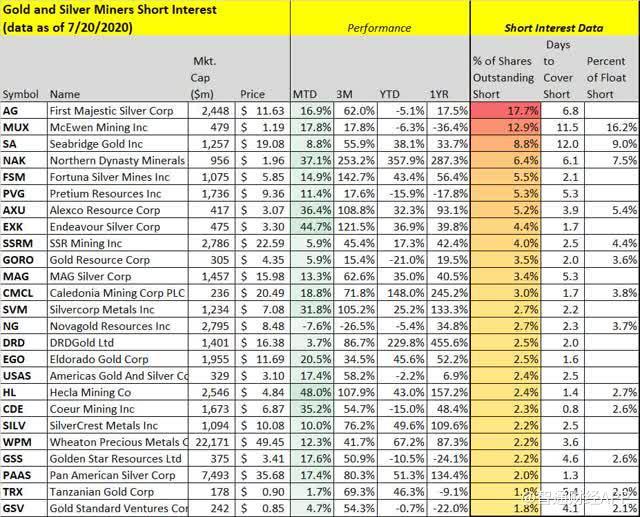 按照上图数据,市值约为25亿美元的加拿大银矿商First Majestic Silver(AG.US)是被做空最多的矿股,报告的做空股数占总流通股的17.7%。该股在2020年表现不佳,截至7月20日,该股今年以来下跌了5.1%,但在7月份上涨了17%。市值4.79亿美元的McEwen Mining Inc.(MUX.US)也是以生产白银为主,今年以来下跌了6.3%,该股做空股数占总流通股的12.9%。