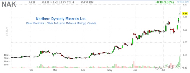 Northern Dynasty Minerals是一家处于勘探和开发阶段的矿业公司,目前没有生产矿井和收入。对于这些收入有限或没有收入的初级矿山,股票估值更多的是基于其资产基础的长期预期价值。最近有报道称,该公司在阿拉斯加的"卵石矿"将获得批准开始建设,这为其增添了看涨势头。金价的走高使得资产基础更有价值。
