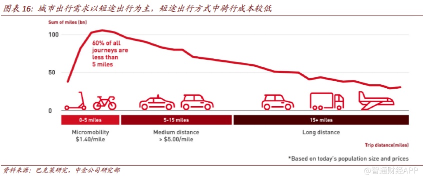 电动自行车:短期看新国标带动替换潮,长期看国内集中度提升、海外出口市场突破 TO C 短途代步需求旺盛,TO B 需求快速增长 电动自行车短途代步需求旺盛。我国城镇化水平不断提升,大城市圈带动出行需求增加。 虽然伴随城市圈扩大,平均出行半径也逐步增加,但根据巴克莱研究,所有出行需求中超 过 60%均为 5 英里以下的短途出行需求。另外,人均交通通勤费用不断提升,经过测算, 短途需求的骑行成本在 1.4 美元/英里,低于驾驶及其他公共交通成本,因此我们认为即便 私家车拥有量仍在提升,电动自行车具备便捷、便宜和环保等特征,能够更好地满足居民 日益增长的短途出行需求。