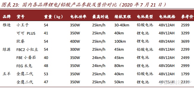 相同续航里程情况下,锂电重量是铅酸电池的三分之一。在满足新国标标准的情况下,装 配铅酸电池的车辆最高为 48V+12AH 配置,续航约 40-50km,而装配锂电电池的车辆一般可 达到 48V+22AH,续航可达到 100km。因为质量较重,铅酸电池在充电便利性、续航里程和 使用寿命等方面存在痛点。消费升级驱动,同时伴随新版《电动自行车安全技术规范》的 实施(简称新国标),对整车质量更加严格的限制,基于兼具新国标要求和满足续航里程的 考量,我们认为会加速锂电渗透率提升。