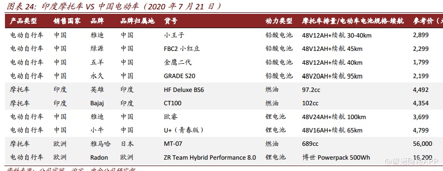 规模效应提供制造优势,具有价格竞争力。国内龙头车企销量规模在百万辆级别,依托我 国电动自行车销量大国的市场优势,以及上游供应链完善的布局,国产产品在价格方面更 具竞争力。我们认为印度及东南亚市场需要先以低端车型作为突破口,我国铅酸电池车型 平均售价在 2,000 元以下,相比当地摩托车车型售价在 4,000 元以上,也同样具有高性价比; 而欧洲市场产品溢价更加明显,电动自行车平均售价在 1,500-3,000 欧元左右,而摩托车价 格更加高昂,例如欧洲摩托车市场销量前 2 的雅马哈 MT-07 售价接近 6 万元,相比之下, 以国产高端电动摩托车小牛 NQi 为代表,国内售价在 6,000 元,较海外竞品也有明显价格 优势。这意味着在海外市场即使保持高性价比,国内车企也将获得更高的利润水平。