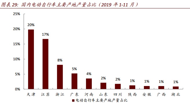 电动自行车:产品高端化、企业规范化是趋势,市场会继续向头部企业集中 轻资产、行业比较分散。目前,已初步形成天津、江苏、浙江三大制造基地的板块格局, 产量占比分别约为 20%、17%、8%。天津主要制造简易款电动自行车、江苏主要生产豪华 款电动自行车,浙江是电机、模具、塑件等零部件的主要生产基地和中国电动自行车生产大省。此外,山东、广东、河南等地也逐步成为电动自行车制造企业的聚集地。