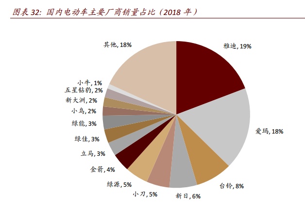 由于电动车制造技术门槛较低,以零部件外采、组装为主,电池、车身等成本占比超过 95%, 而资产较轻,折旧占比在 1.5%左右,因此导致行业格局比较分散。2018 年电动自行车 CR5 市占率达到 55%、CR10 达到 73%,市占率不足 1%的尾部企业累计销量规模仍有 500 万辆。 目前雅迪、爱玛已经成为行业两大巨头,市占率均接近 20%,新日、台铃为第二梯队,市 占率在 5-10%,其他地方龙头品牌市占率均在 5%以下。