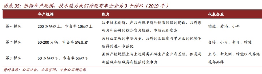 根据年产规模、技术能力我们将现有车企分为 3 个梯队,往前看,下述 3 个梯队企业,我 们认为 1、2 梯队企业市占率会持续提升,其中 1 梯队企业提升速度更快,而第 3 梯队企业 将逐步淘汰出清。