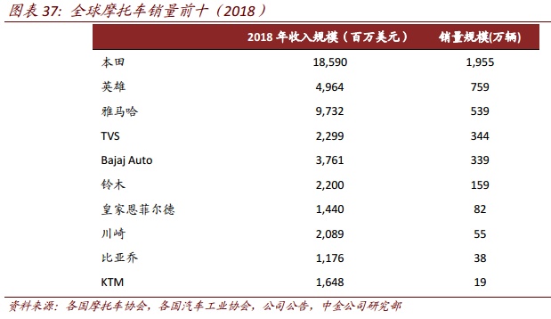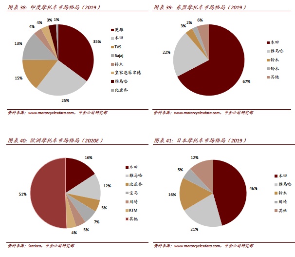 全球市场格局比较稳定,日本、印度品牌具备领先优势。全球前十大摩托车制造商分别为 本田、雅马哈、英雄和哈雷等,2018 年累计销量占全球销量比在 65%以上,其中最大的本 田销量规模在 1,955 万辆。前十家企业中,包括 4 家日本制造商,本田、雅马哈、铃木和 川崎,销量占比达到 40%,在日本、东南亚、欧洲和印度摩托车主要销售地区均有较强的 市占率布局,具有深厚的产业链生产经验,以及中高端的产品定位布局。印度品牌英雄、 TVS 和 Bajaj 占据 3 个位置,主要受益于本地巨大的市场需求。参考全球主要摩托车销售地 区各品牌销量情况,印度、日本、东南亚 CR4 市占率均接近 80-90%,由于摩托车发展历史 悠久,已经形成了相对稳定的市场格局。