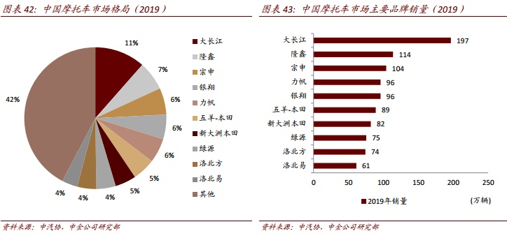 国内中小排量摩托车市场分散。国内自主品牌厂商生产集中在中小排量摩托车市场,市场 格局相对分散。2019 年销量前十的企业分别为长江、隆鑫、宗申等,其中 CR5、CR10 分别 在 40%、60%左右,市占率不足 5%的企业累计销量占比超过 50%。虽然中小排量摩托车市 场规模收缩,但市场发展多年,叠加摩托车保有量向农村收缩,驱动行业优胜劣汰、集中 度提升的动力有限,多年未出现集中度提升的趋势。