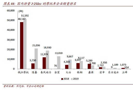 大排量市场以进口为主,进入门槛高。2019 年中国摩托车总销量约为 1,713 万(包含出口), 250cc 以上排量摩托车销量为 17.7 万辆,进口比例约为 20%;400cc 以上摩托车销量为 2.7 万辆,进口比例超过 50%。中大排量摩托车进口比例高的核心原因在于技术门槛较高,主 要技术门槛在于发动机的制造技术,大排量摩托车对发动机散热要求高,需要采用水冷技 术,而基于中小排量摩托车为主的发展背景,国内从事水冷发动机生产制造的企业数量较 少。 国产企业龙头集中度高,进口替代有突破空间。目前部分具备一定研发设计实力的国产企 业,已经开始发力中大排量市场。2019 年在中大排量摩托车市场中,钱江摩托、隆鑫通用、 春风动力销量分别达到 5.2 万辆、2.1 万辆、1.9 万辆,销量增速分别为 7%、267%、58%, 国产 CR3 市占率达到 69%。我们认为上述龙头公司,通过多年钻研已经掌握核心发动机技 术,同时通过跟外资品牌的合作学习,已经具备先进的整车设计和制造能力,有望逐步凭 借高性价比、强产品力的车型实现中大排量摩托车的部分进口替代。