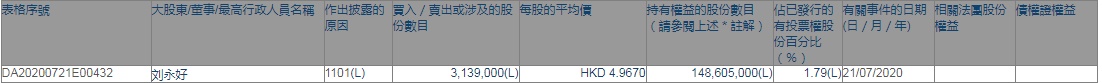 智通财经APP获悉,香港联交所最新资料显示,7月21日,非执行董事刘永好增持民生银行(01988)313.9万股,每股作价4.9670港元,总金额约为1559.14万港元。增持后最新持股数目约为1.48亿股,最新持股比例为1.79%。