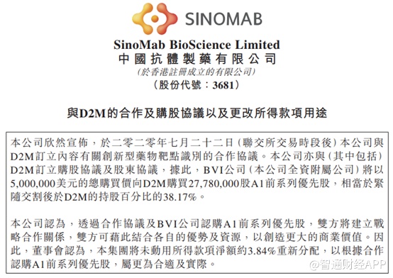 7月22日,中国抗体-B(03681)宣布其与D2M