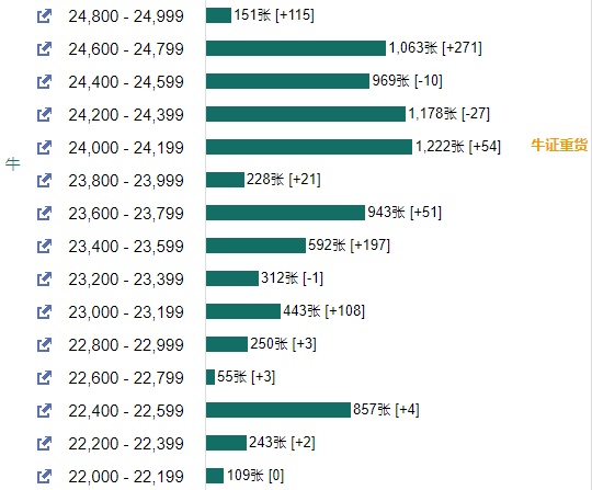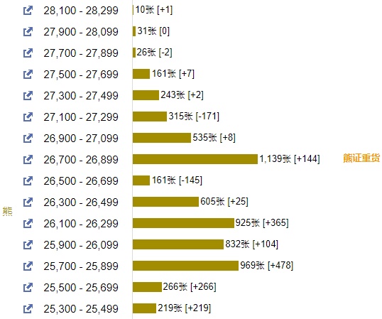 智通财经APP获悉,截至7月23日,恒指最新的牛熊街货比例57:43。摩根恒指牛熊证街货分布图中的数据显示,熊证街货重货区在26700-26899区间,该区间最新熊证数量为1139张,较上一交易日增加114张,最多新增25700-25899区间,该区间最新熊证数量为969张,较上一交易日增加478张。牛证街货重货区在24000-24199区间,该区间最新牛证数量为1222张,较上一交易日增加54张,最多新增区间24600-24799区间,该区间最新牛证数量为1063张,较上一交易日增加271张。