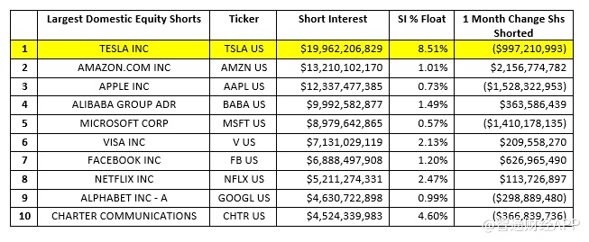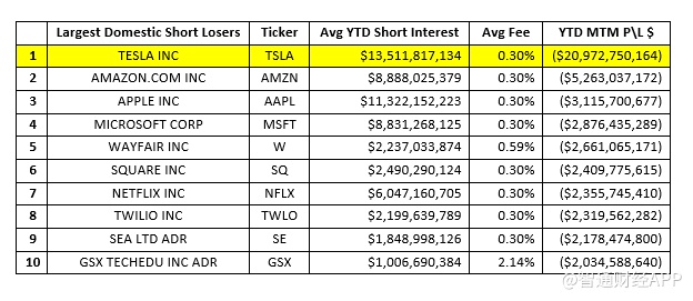 特斯拉空仓规模接近200亿美元;做空股数达1254万,空仓占市场流通股的8.51%;股票借贷手续费为0.30%。特斯拉是目前美股市场上遭到做空最多的股票。
