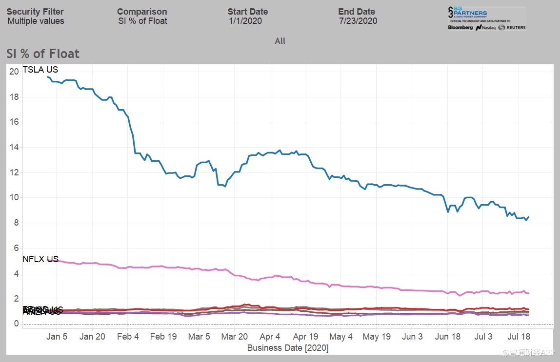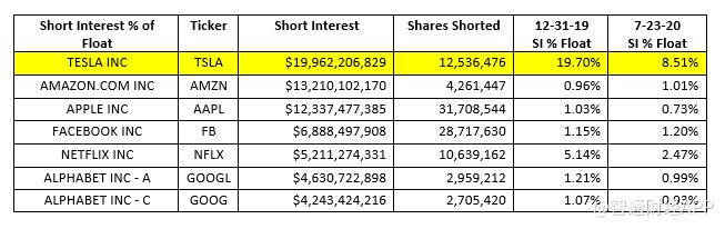 相比“FAANG”等其他被大规模做空的股票,特斯拉的空头回补情况要严重得多。从空仓占市场流通股的百分比来看,只有Netflix(NFLX.US)的空仓规模整体有明显下降。谷歌母公司Alphabet(GOOGL.US)、亚马逊(AMZN.US)、苹果(AAPL.US)以及Facebook(FB.US)的空仓占市场流通股的比例在2020年只发生了很小的变化,如下图所示。