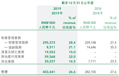 多项收购标的并表带动营收高增长,但是也拉低了毛利率和抬高费用率,导致利润仅是小幅增长。智通财经APP了解到,2019年公司新增两项业务,房地产代理业务和清洁及绿化业务。其中房地产代理业务来自公司收购辉煌置业以及辉煌房地产的并表。清洁及绿化业务主要来自公司收购佛山派瑞尔、桂林深港、上海汤年、上海汤磊四家公司的并表,其中桂林深港在2019年并表,另外三家则是2018年已经并表。同时,公司还收购了广东铭锦城园林景观设计,于2019年2月开始并表,收购的杭州安嘉、苏州建屋置业两家物业管理公司,也于2019年5月开始并入公司物业管理服务收入,推高了物管收入的增长。多家收购企业并表,直接带动公司全年营收同比增长48.5%至15.20亿元人民币,