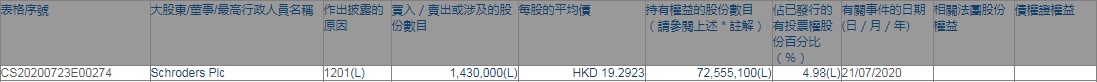 智通财经APP获悉,香港联交所最新资料显示,7月21日,Schroders Plc减持嘉里建设(00683)约143万股,每股作价19.2923港元,涉及总金额约为2758.80万港元。减持后最新持股数目约为7255.51万股,最新持股比例4.98%。