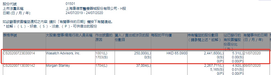 智通财经APP获悉,香港联交所最新资料显示,7月21日,Wasatch Advisors, Inc.增持康德莱医械(01501)25万股,每股作价65.09港元,总金额为1627.25万港元。增持后最新持股数目为244.16万股,最新持股比例为5.31%。