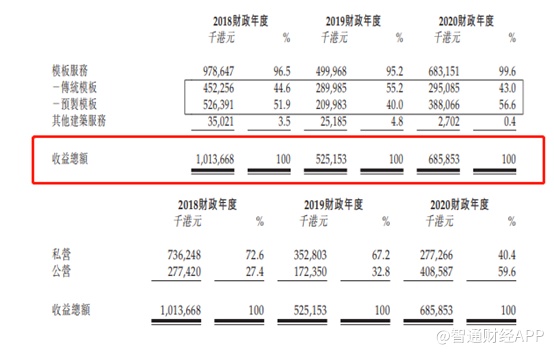 模板服务分为传统模板和预制模板。智通财经APP观察到,2018至2020财年,智勤控股的模板服务收入占比分别达到96.5%、95.2%及99.6%,整体而言又以预制模板收入占比更大,2020财年传统模板和预制模板收入占比分别为43%及56.6%。