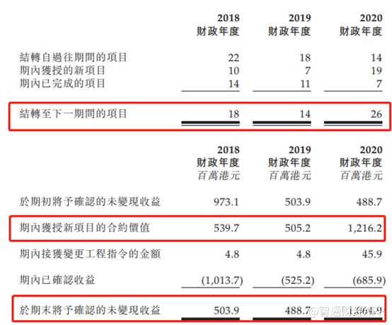 由于项目周期导致的收入确认错配,从上一财年的项目数量和合约价值大致可以判断下一财年的收入情况。智通财经APP发现,2020财年期间,智勤控股的新增项目明显变多,从上一年财年的7个增加至19个,2020财年完成项目7个,结转至下一期项目数量为26个。