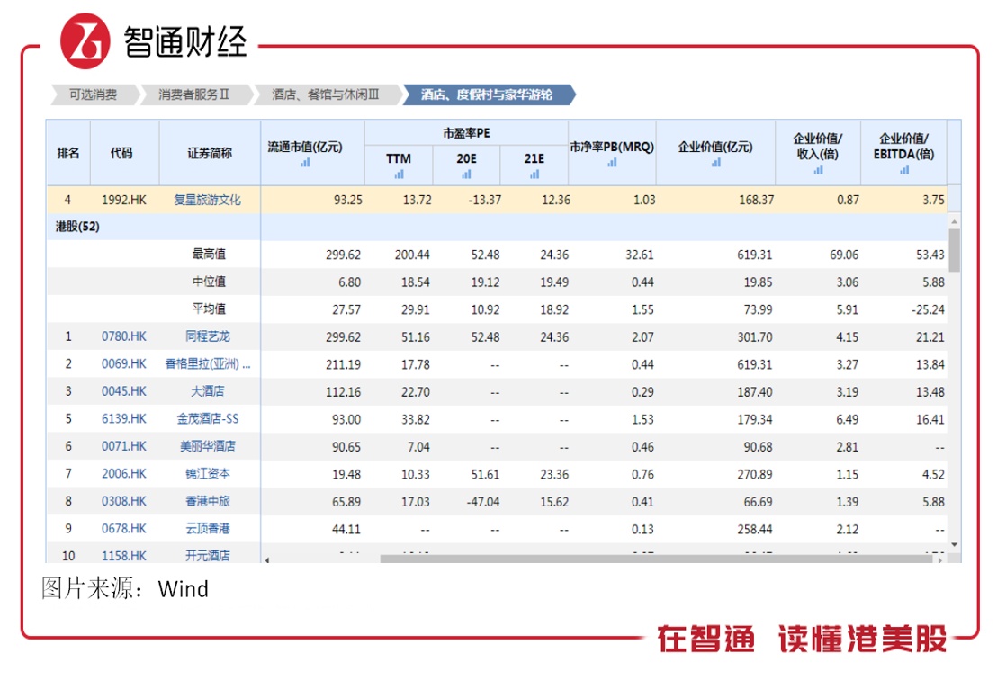 卫生事件导致旅游行业板块估值大幅度下杀,复星旅文也不例外,根据相关软件,目前该公司PB值跌至1倍,相当于净资产水平,而参照上述对EBITDA预计,市值/EBITDA(2021年)仅为1.73倍,对应运营板块的EBITDA为3倍,明显是被低估的。