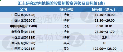 二、汇丰研究对部分内地保险股最新投资评级及目标价