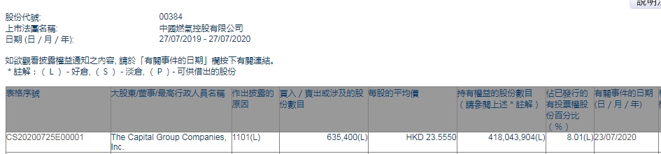 智通财经APP获悉,香港联交所最新资料显示,7月23日,美国资本集团增持中国燃气(00384)63.54万股,每股作价23.555港元,总金额为1496.68万港元。增持后最新持股数目为4.18亿股,最新持股比例为8.01%。