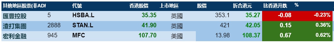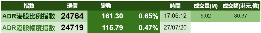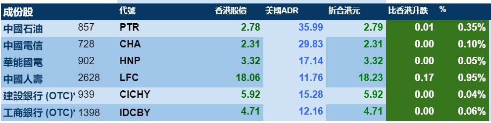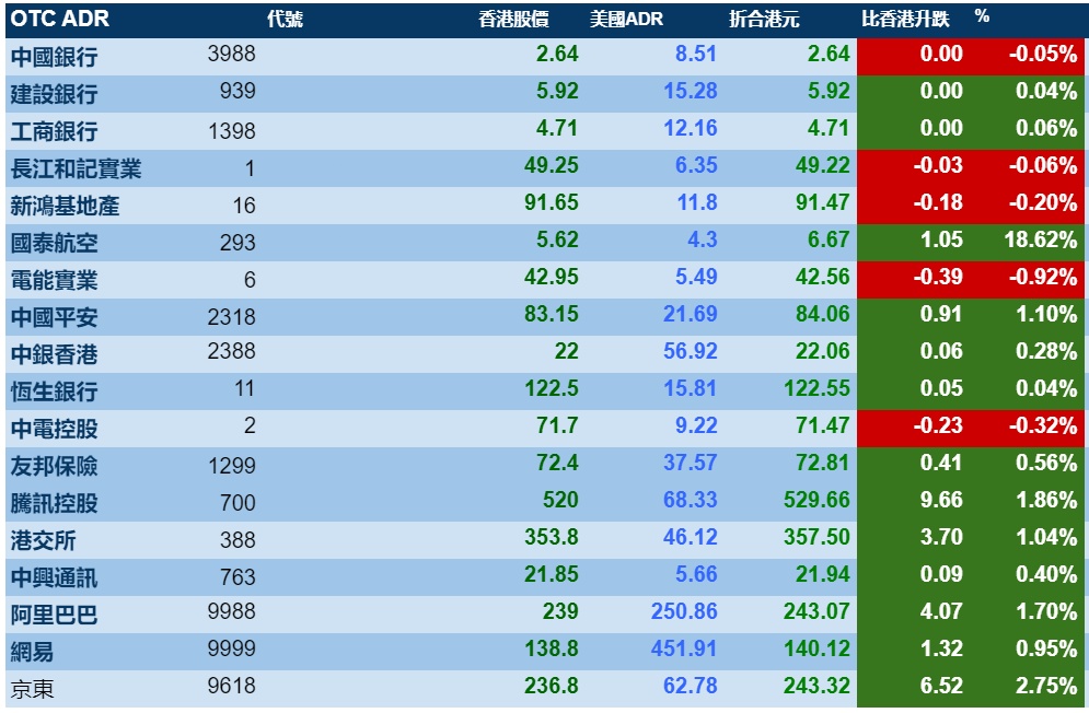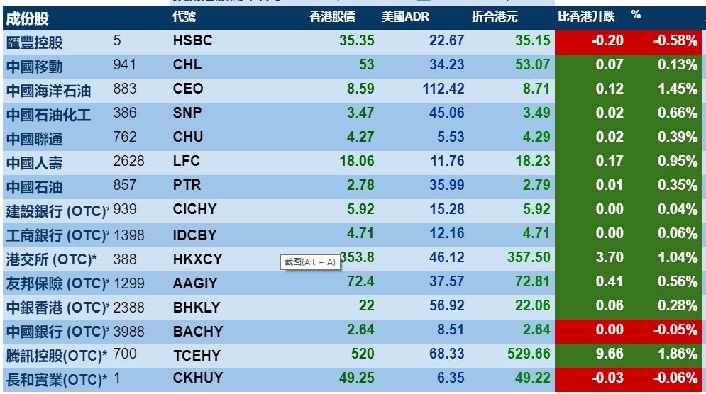 周一美国三大股指走强,在行情带动下,港股ADR指数上涨,按比例计算,收报24764点,涨161.30点或0.65%。大型蓝筹走势不一,汇丰控股收报35.15港元,较港收市跌0.20港元;腾讯控股收报529.66港元,较港收市升9.66港元。
