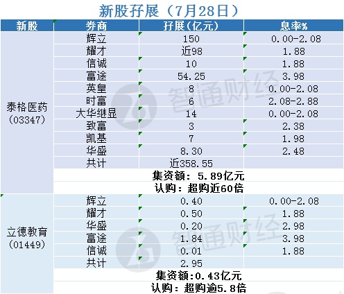 智通财经APP获悉,泰格医药(03347)、立德教育(01449)正在招股中。截至7月28日,辉立 、耀才、信诚等券商合计分别为其借出近358.55亿港元、2.95亿港元。其中,泰格医药超购近60倍,立德教育超购逾5.8倍。