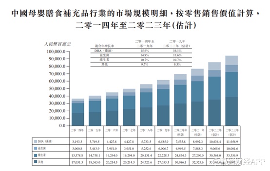 国内母婴膳食补充品发展迅速,可细分为维生素、益生菌、DHA等等。智通财经APP观察到,2014年至2019年按照零售额计算,母婴DHA(藻油)分部在中国所有母婴膳食补充品中增速最快,年复合增长15.6%,至2019年达到65.9亿元。