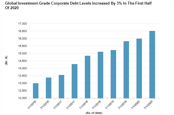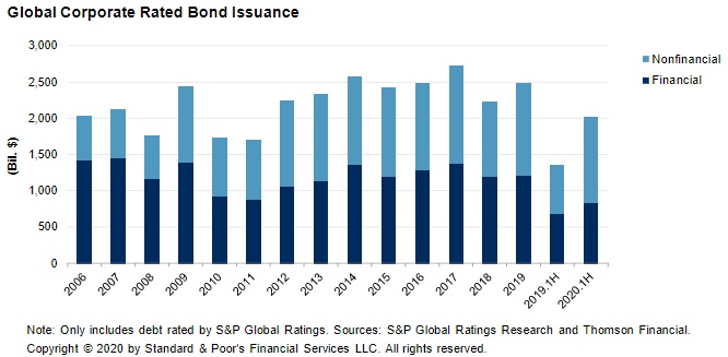 2020年上半年,全球企业债券发行量达到创纪录的2万亿美元,同比增长49%。新债发行激增的一个重要原因是,全球央行为应对卫生事件引发的全球经济衰退而采取行动增加融市场流动性(包括购买公司债券)。这些新发行的债券大部分用于现有债券的再融资和一般公司用途。许多公司试图增加现金余额,以满足营运资本需求或因收入骤减而导致的其他现金流出。