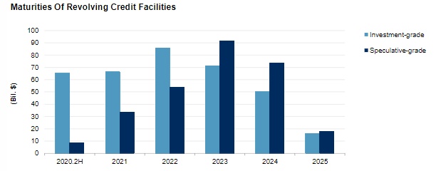2020年3月,美国和欧洲的卫生事件病例不断增加,许多公司在面临一级发行市场流动性不足的情况下,利用其循环信贷额度进行融资。LCD数据显示,美国企业从循环信贷工具中提取了逾3160亿美元,其中大部分提取发生在3月和4月。相比之下,标普全球评级估计截至2025年到期的循环信贷额度(包括已提取的金额以及未提取的金额)为6348亿美元。目前未偿还的循环信贷额度中,只有6%是在2020年上半年提取的,大部分是在2017年至2019年提取的。