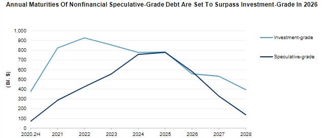 在截至2025年到期的非金融企业债券中,有2.87万亿美元属于投机级债券,这些债券的到期期限集中在2023-2025年(届时73%将到期)。2025年到期的投机级非金融企业债券达到顶峰(预计将有7779亿美元到期)。到2026年,到期的投机级债券将超过投资级债券。然而,标普全球评级预计,在这些年中,到期的投资级债券将继续增加,随着新债券的发行,最终将超过投机级债券。