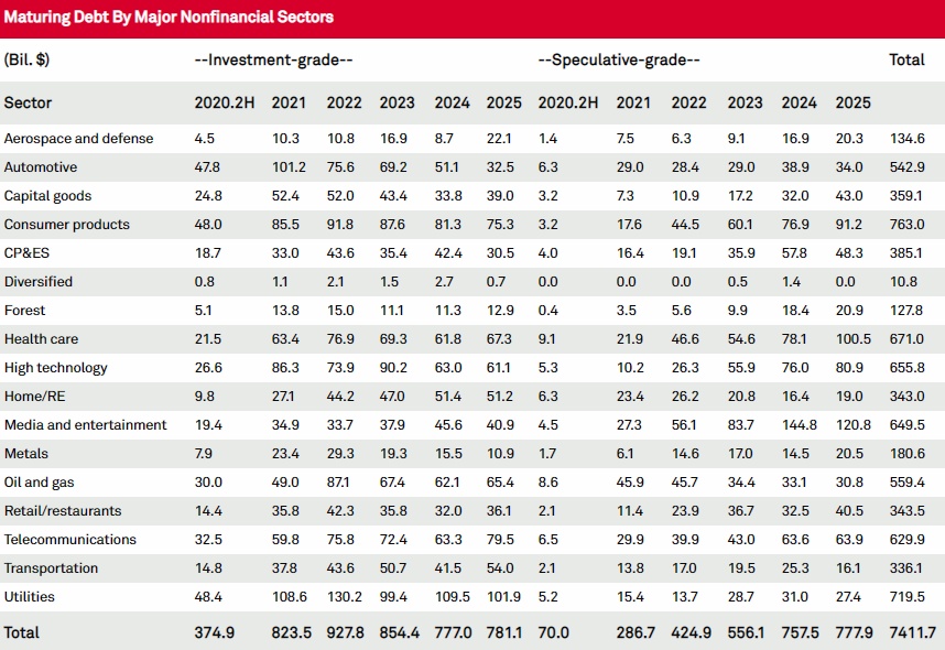 公用事业公司有7195亿美元的债券将在2025年及之前到期。在这些债券中,83%属于投资级,高评级与该行业的监管性质有关。标普全球评级预计,公共卫生事件之后,该行业将继续面临挑战,包括商业和工业负荷下降、坏账支出上升、缺乏持续进入股市的渠道和养老金不足等。然而,由于投资级信贷高度集中于该行业,预计该行业的整体信贷水平仅会略有下降。