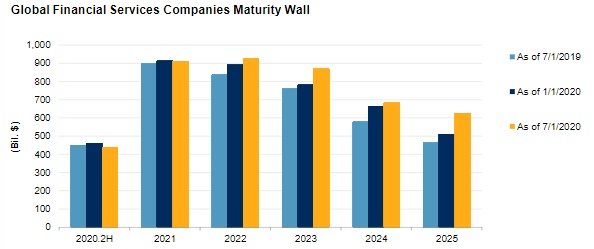 今年年初以来,2020年下半年至2025年到期的金融服务业债券增长5%,增幅最大的是2025年到期的1130亿美元债券。